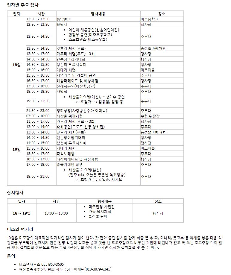 특히 해상에 주무대가 설치되어있어 독특하고 신비로운 축제를 경험하실 수 있고, 가족 낚시체험을 위하여 미조항내 우럭, 도미 등 1톤을 방류하였으니 많이 오셔서 신선한 생선의 참 맛을 느껴보시기 바랍니다.