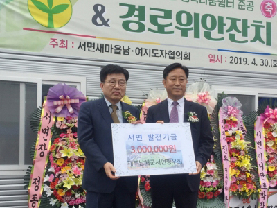 곽명균 재부남해군서면향우회장이 서면행복나눔쉼터 준공식 및 경로위안잔치에 참석해 사랑하는 고향 발전을 위한 기금 300만원을 쾌척했다.